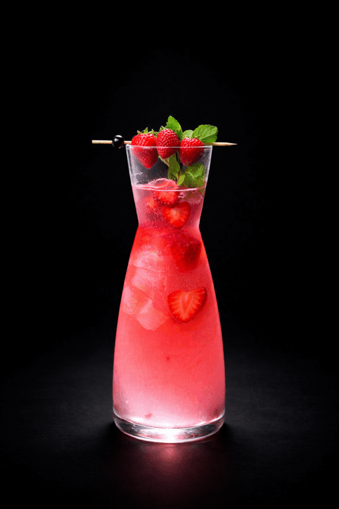 strawberry syrup/puree, lemon juice, strawberry, mint, soda water/water